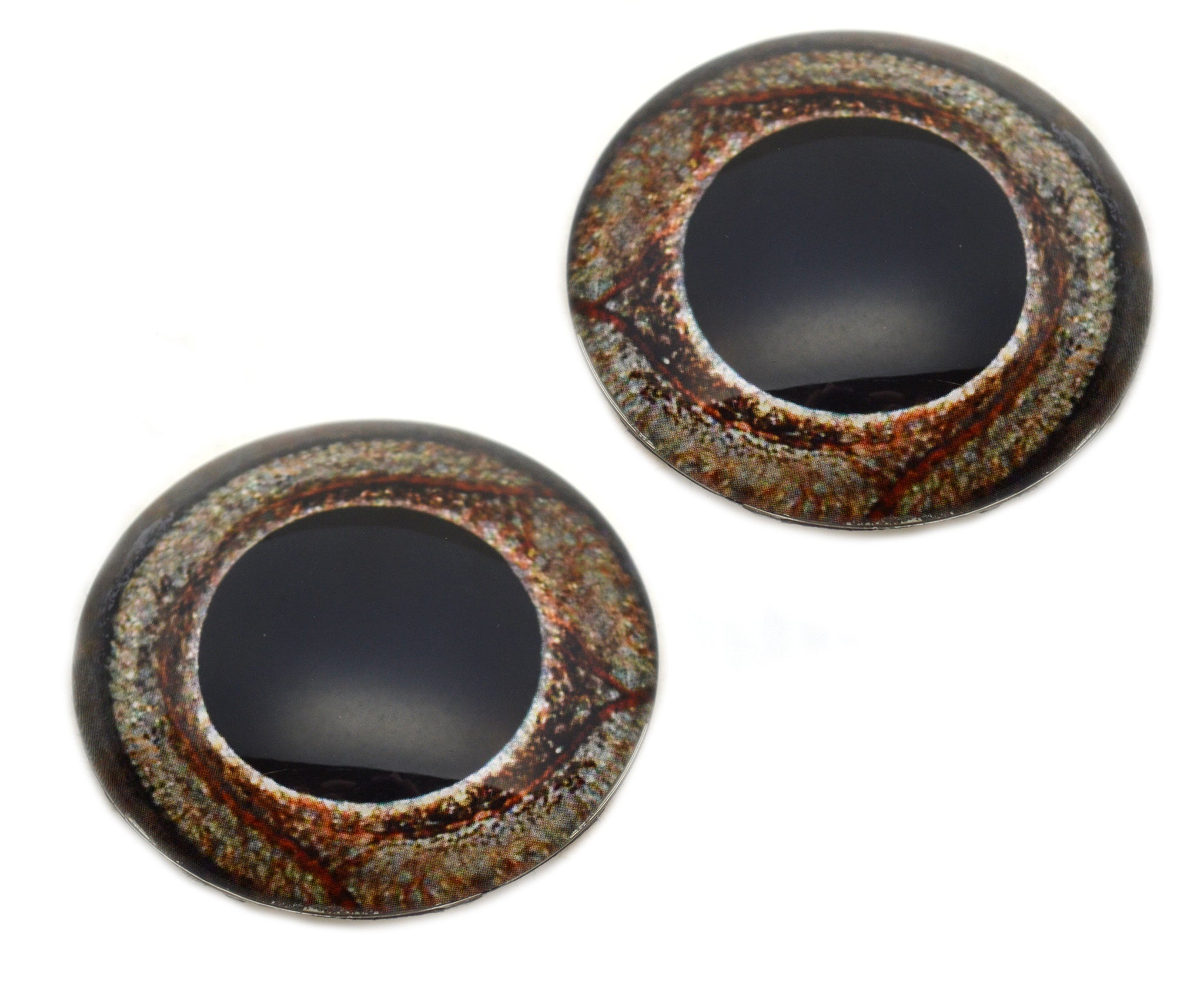 This glass eye design is available as a single eye or pair of eyes in sizes 78mm, 60mm, 50mm, 40mm, 30mm, 25mm, and 20mm, and as a pair of eyes in 16mm, 14mm, 12mm, 10mm, 8mm, and 6mm.