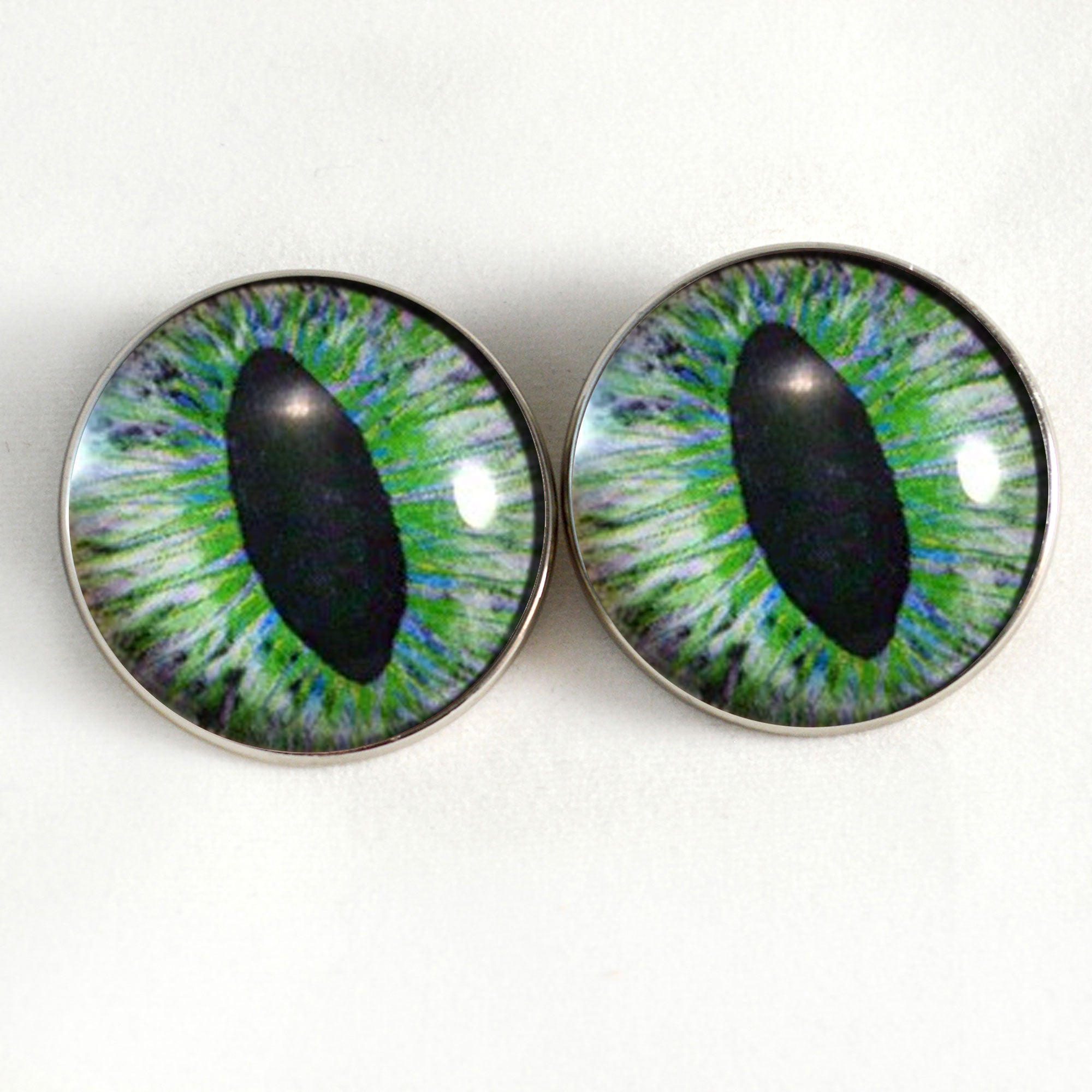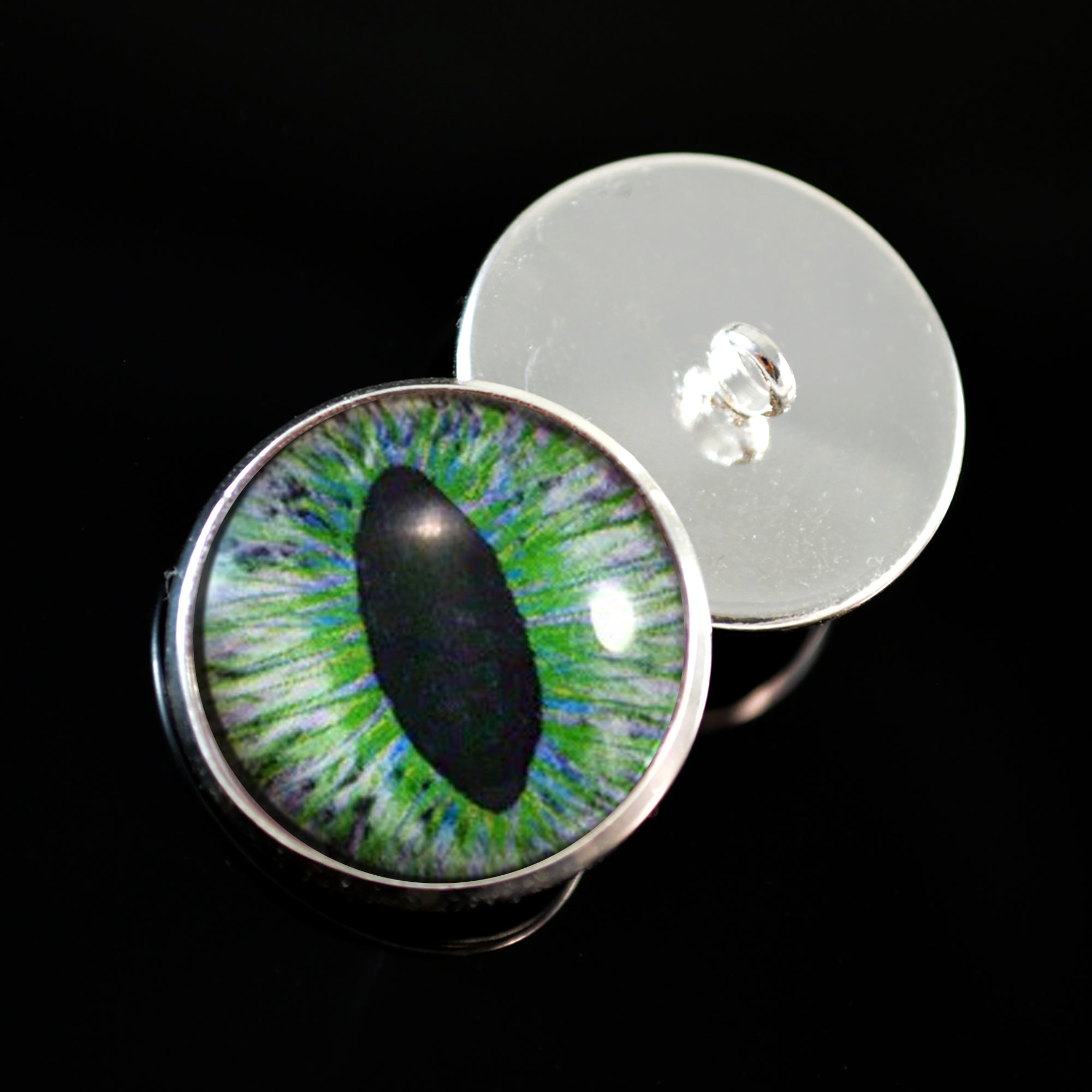 Pick your size of 10mm, 16mm, 25mm, or 30mm for a detailed, fantasy green and peach dragon or cat sew-on glass button eyes. These handmade eyes add complex life to your creations, with their intriguing design.