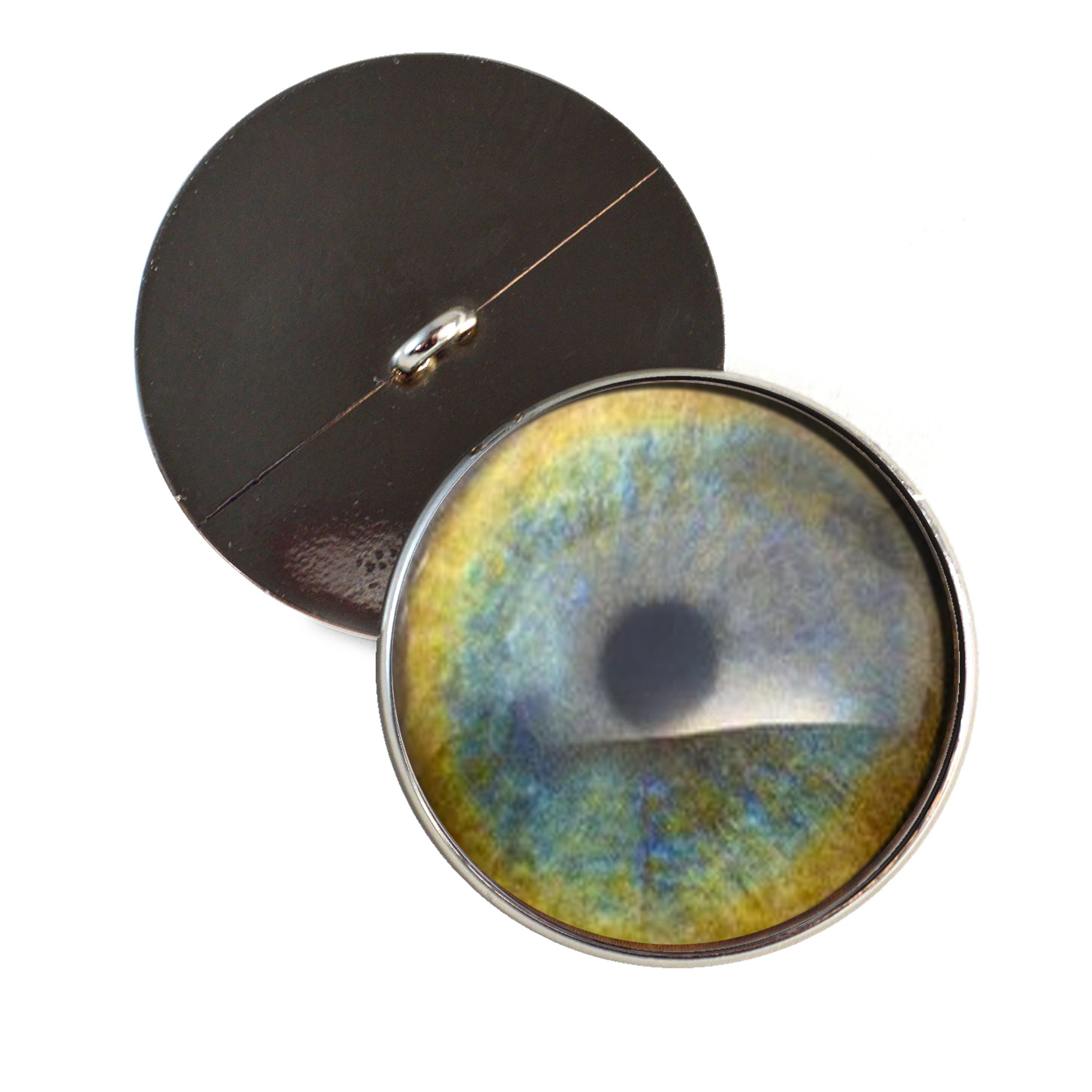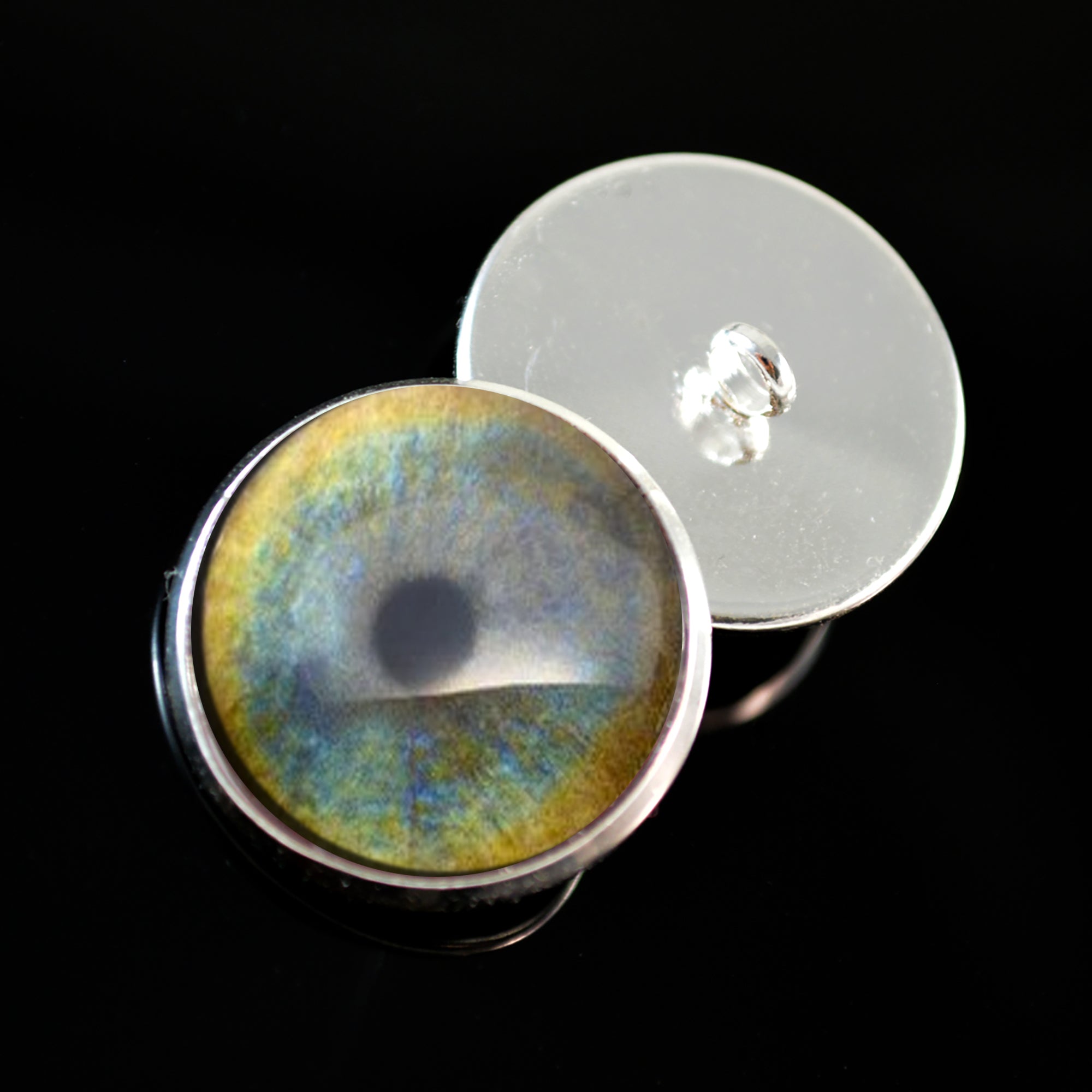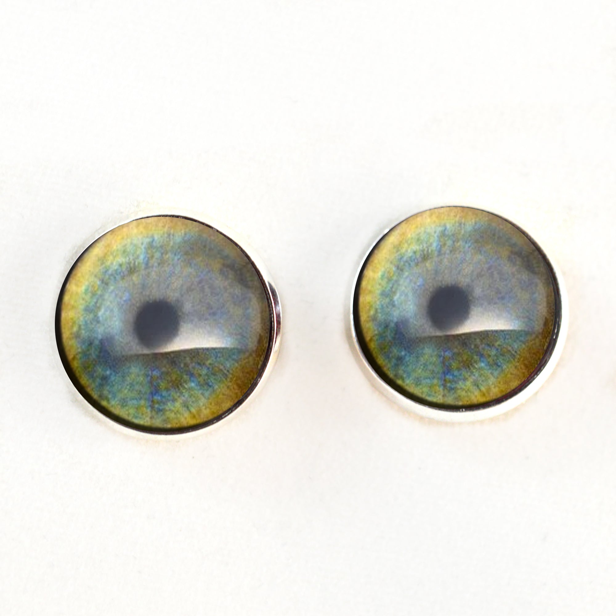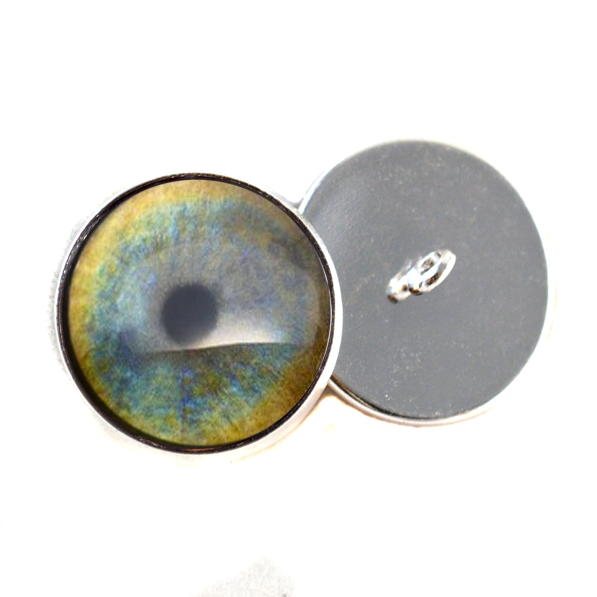 These glass eyes are buttons with a loop on the back of their silver-colored metal settings. This pair of glass eyes is perfect for creating your stuffed or crochet animal creature or soft sculpture, or for use in creative jewelry making.