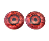 These handmade glass eyes depict blood spattered scary, horror inspired sinister red irises surrounded by bloodshot scleras.
