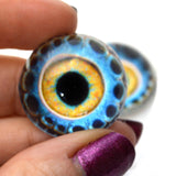 These handmade, hemisphere glass kraken eyes depict realistic, bright blue and yellow, tentacle decorated irises straight from the depths of the ocean.