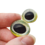 These handmade, hemisphere glass bird eyes depict realistic, light green parrot irises inspired from intriguing birds.