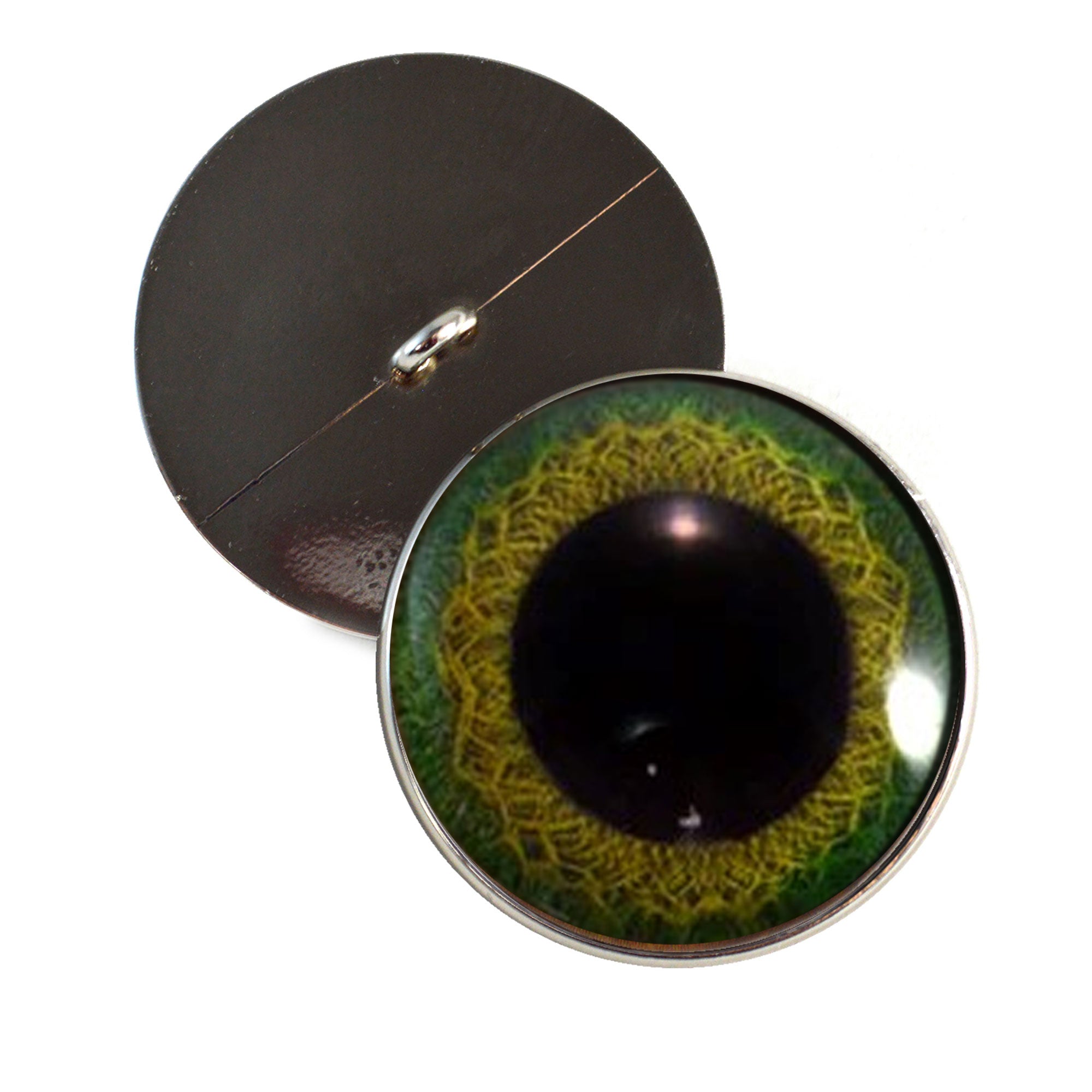 Pick your size of 10mm, 16mm, 25mm, or 30mm for a detailed, fantasy green and yellow Celtic weave sew-on glass button eyes. These handmade eyes add complex life to your creations, with their intriguing design.