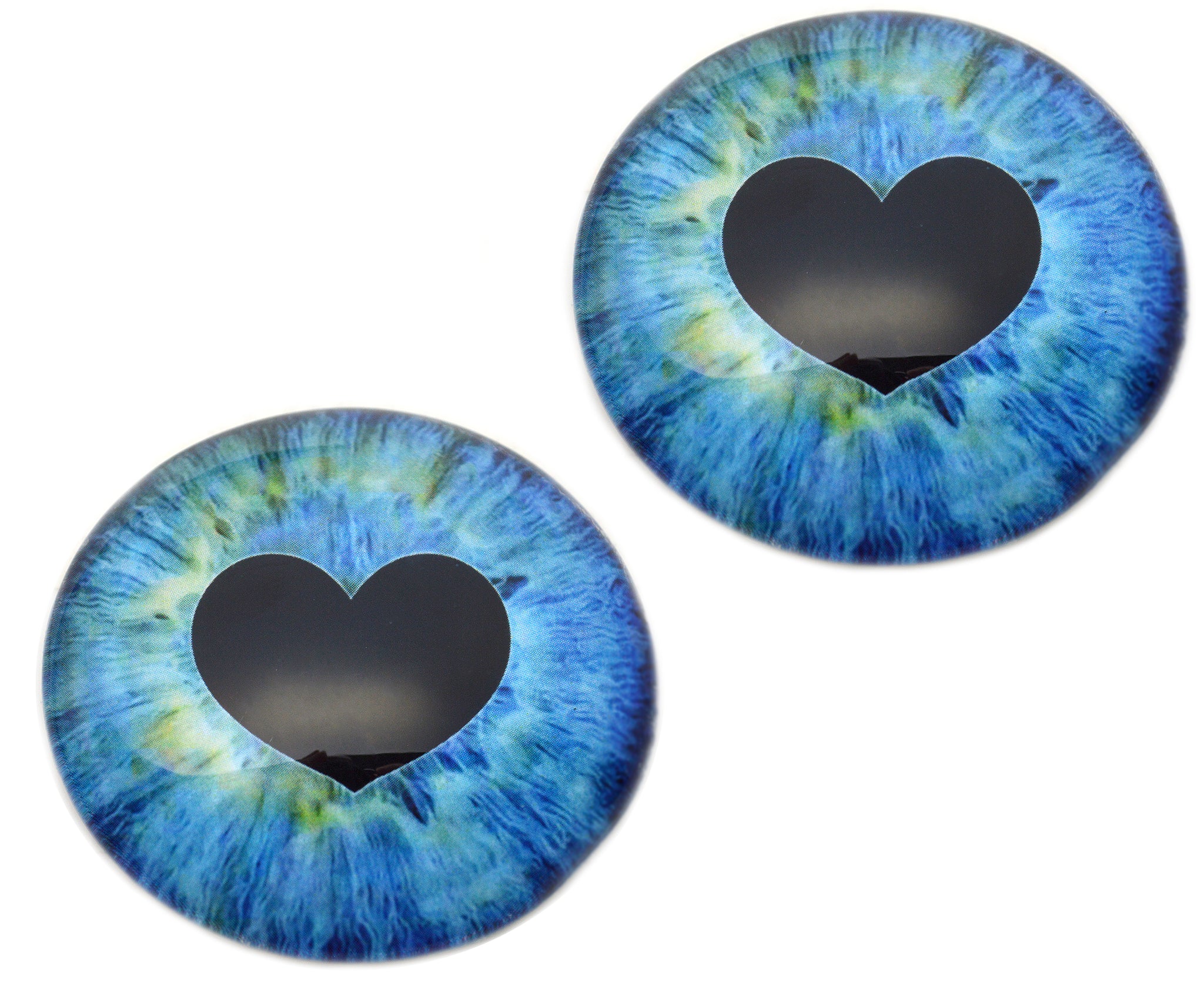 These handmade glass eyes depict romantic, fantasy-inspired blue glass eyes with heart-shaped pupils.