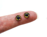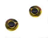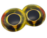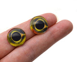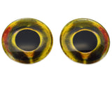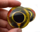 Make an impact on your project with these realistic, textured bright yellow, black, and red hued tropical fish inspired glass cabochons. These intense lifelike fish eyes are contain detailed irises surrounding wide, circular-shaped, mirrored irises.