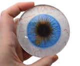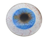 This glass eye design contains a white sclera with thin red veins surrounding a natural blue iris and solid black pupil.