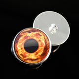 These detailed, majestic rounded pupil fire glass eyes will mesmerize with the intricate iris detail in this set of orange flame inspired pair of eyes. Sharp and richly shaded colors draw the eye and allow for easy placement on art dolls, jewelry, sculptures, props, cosplay decorations, or anywhere else you can think of!
