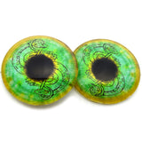 These glass eye designs feature detailed, Loki snake design surrounding round irises in brightly colored green and gold irises.