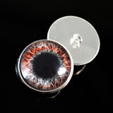 These red and black round gothic fantasy glass eyes contain round black pupils surrounded by intricately rendered iris design in a mix of black, white and intense red. Sharp and richly shaded colors draw the eye and allow for easy placement on art dolls, jewelry, sculptures, props, cosplay decorations, or anywhere else you can think of!