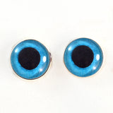These glass eye cabochons are set in silver toned metal button bezels with sew-on loops on their backs. These sew-on glass eyes are perfect for soft sculptures, plushies, stuffed animals, and as buttons for unique clothing.