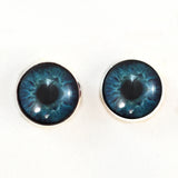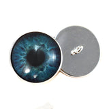 These glass eye cabochons are set in silver toned metal button bezels with sew-on loops on their backs. These sew-on glass eyes are perfect for soft sculptures, plushies, stuffed animals, and as buttons for unique clothing.