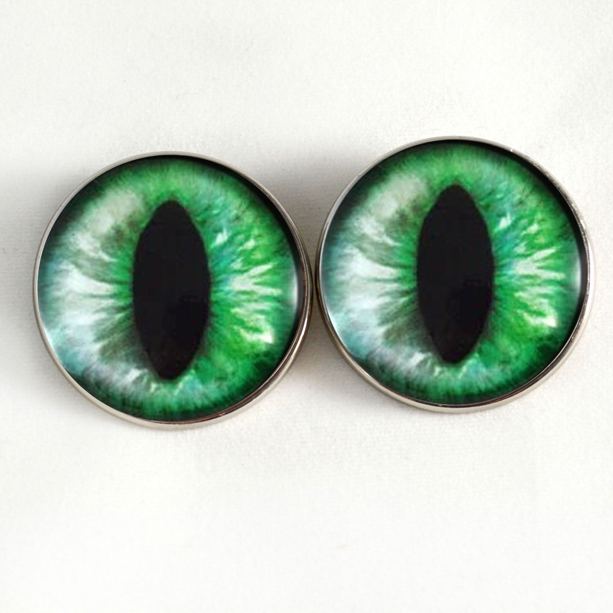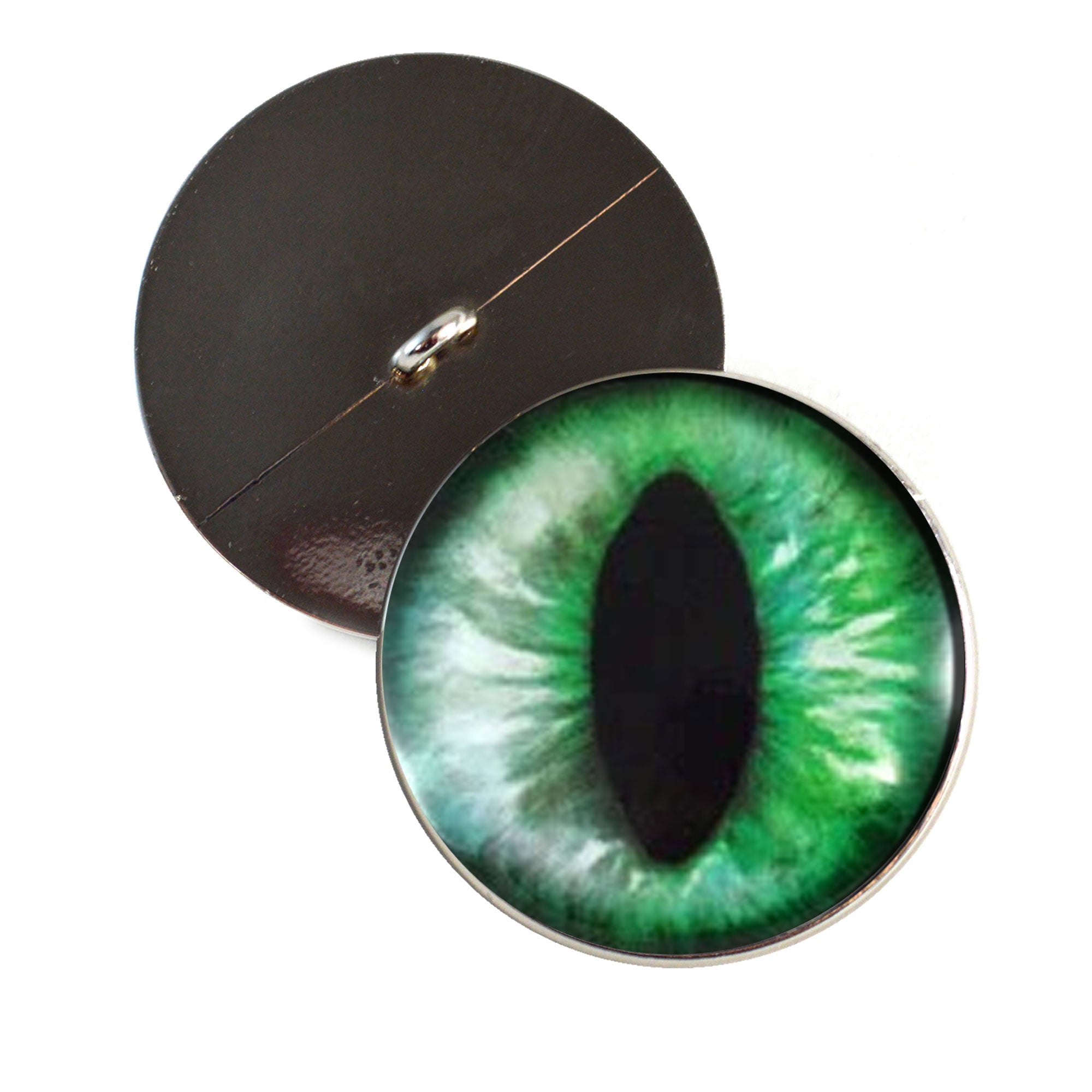 Pick your size of 10mm, 16mm, 25mm, or 30mm for a detailed, fantasy green and white dragon or cat sew-on glass button eyes. These handmade eyes add complex life to your creations, with their intriguing design.