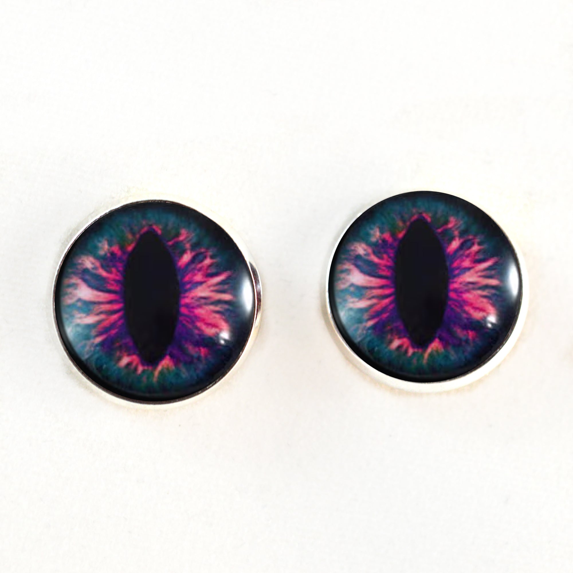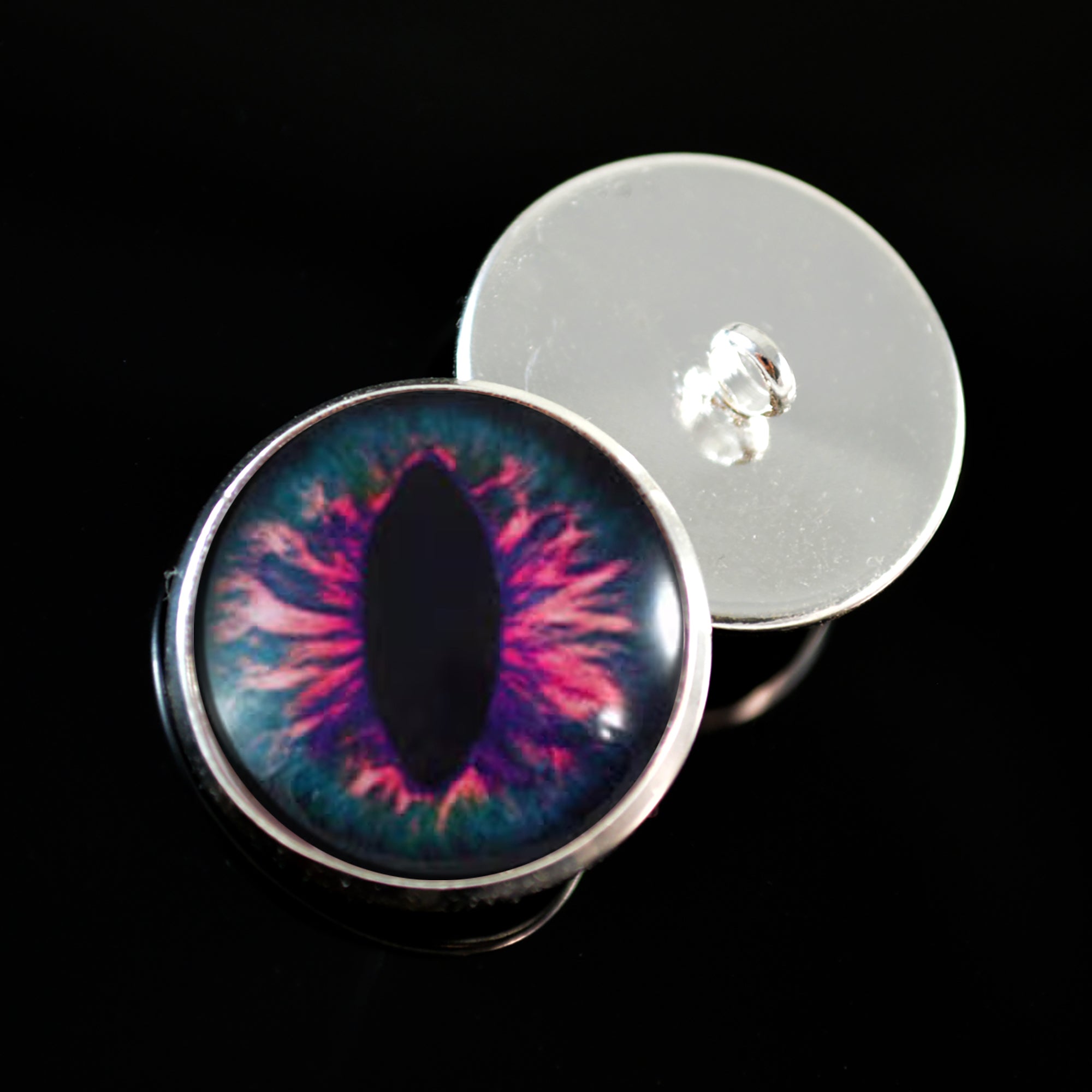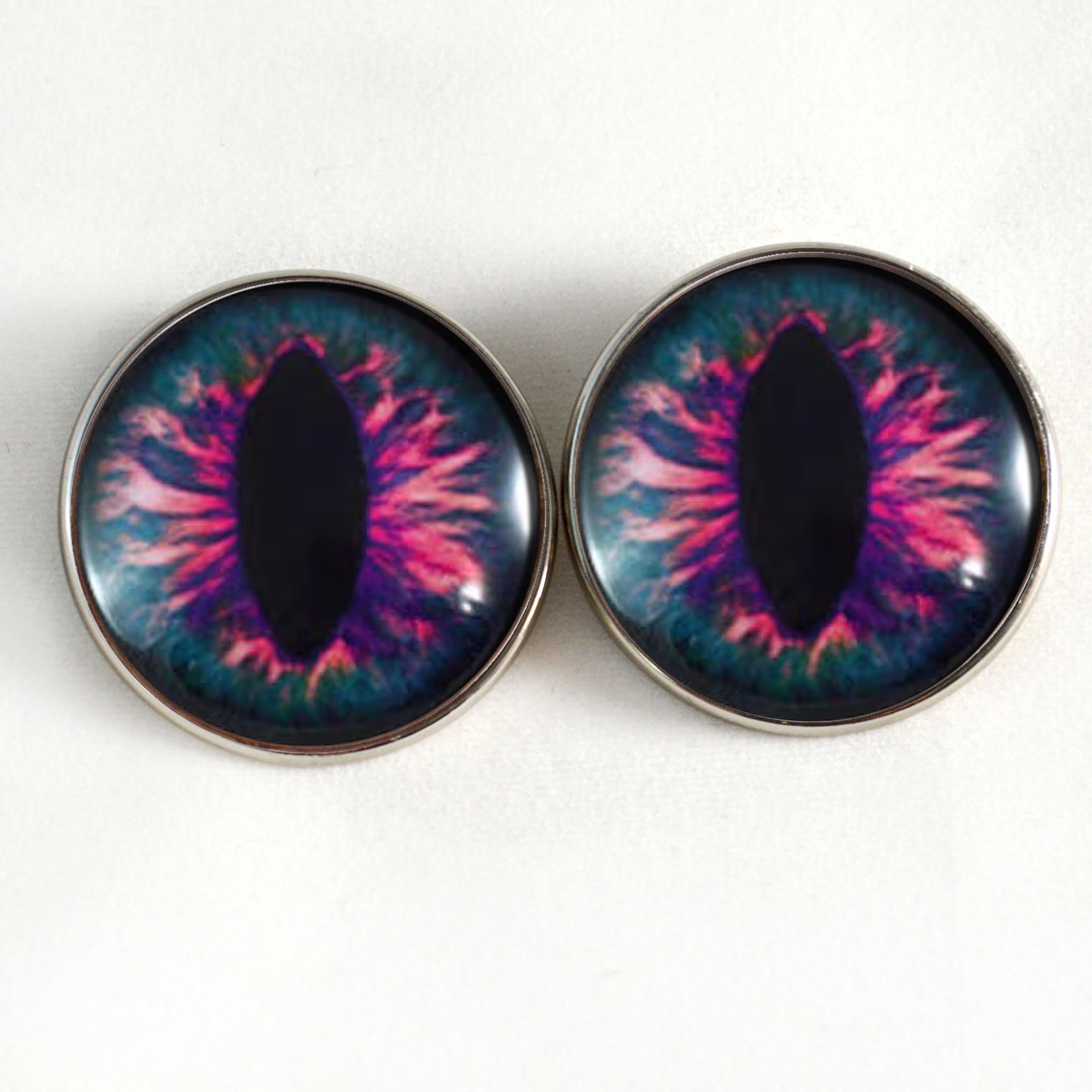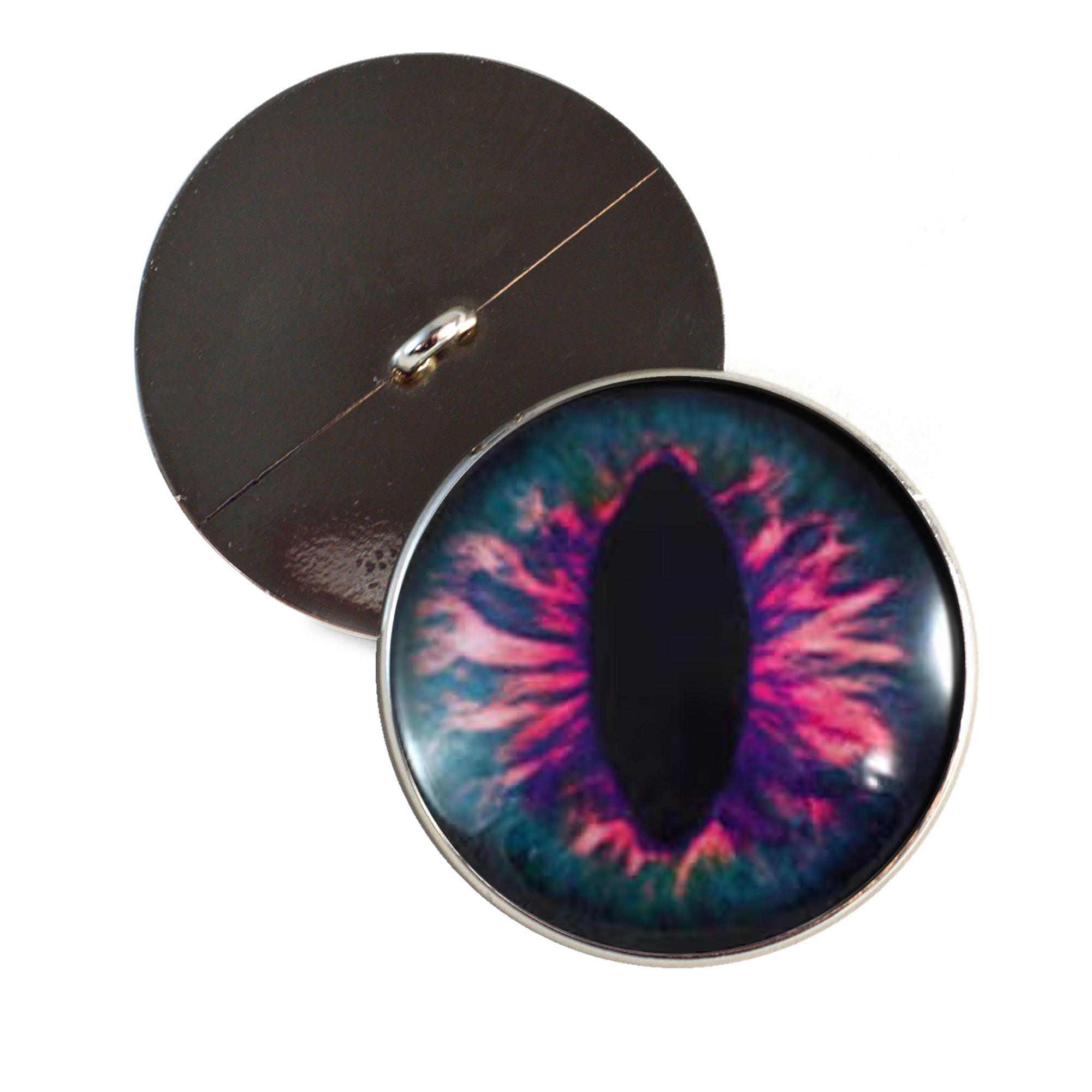These riveting sew on button glass eyes depict a mystical, pink and blue dragon eyes.