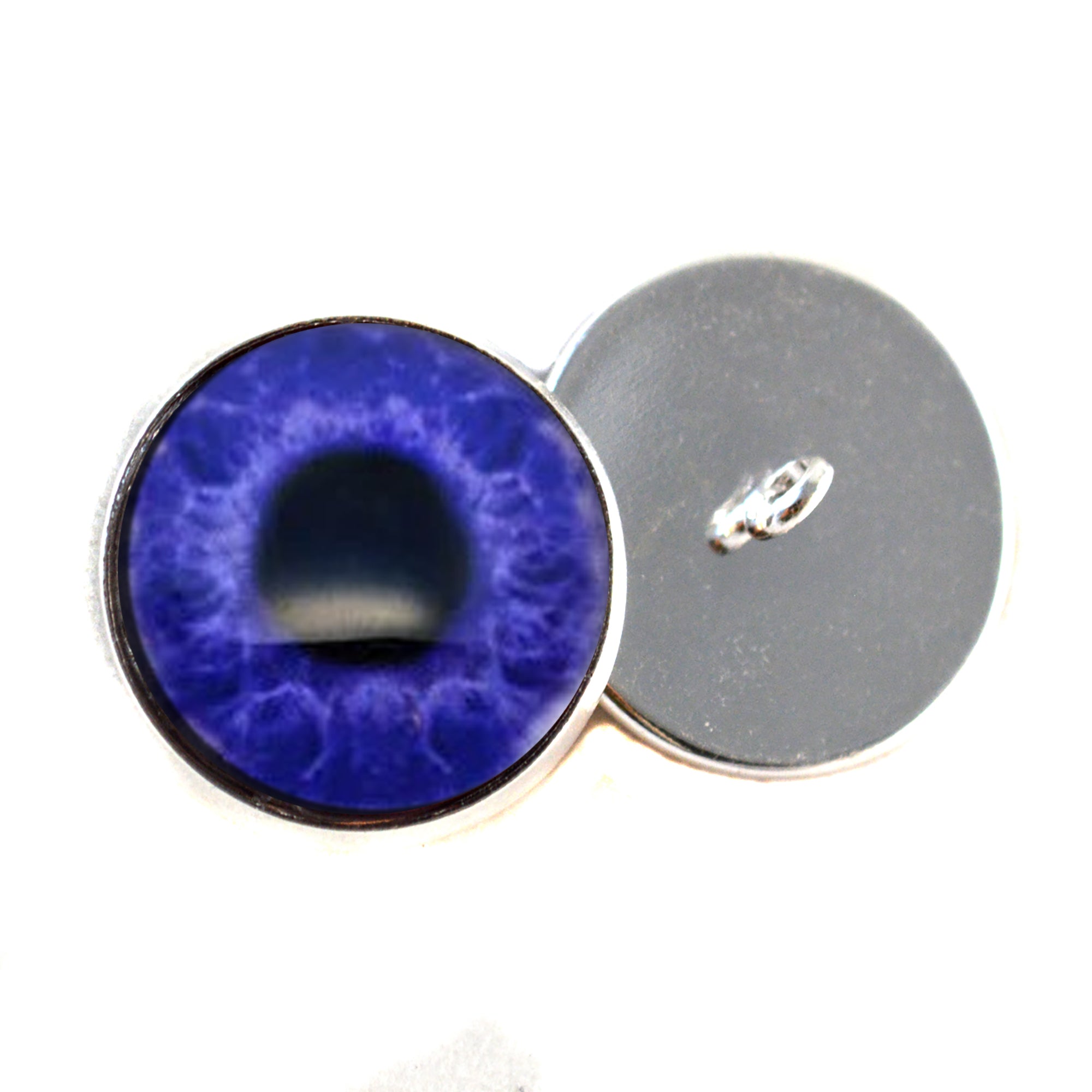 These glass eyes are buttons with a loop on the back of their silver-colored metal settings. This pair of glass eyes is perfect for creating your stuffed or crochet animal creature or soft sculpture, or for use in creative jewelry making.