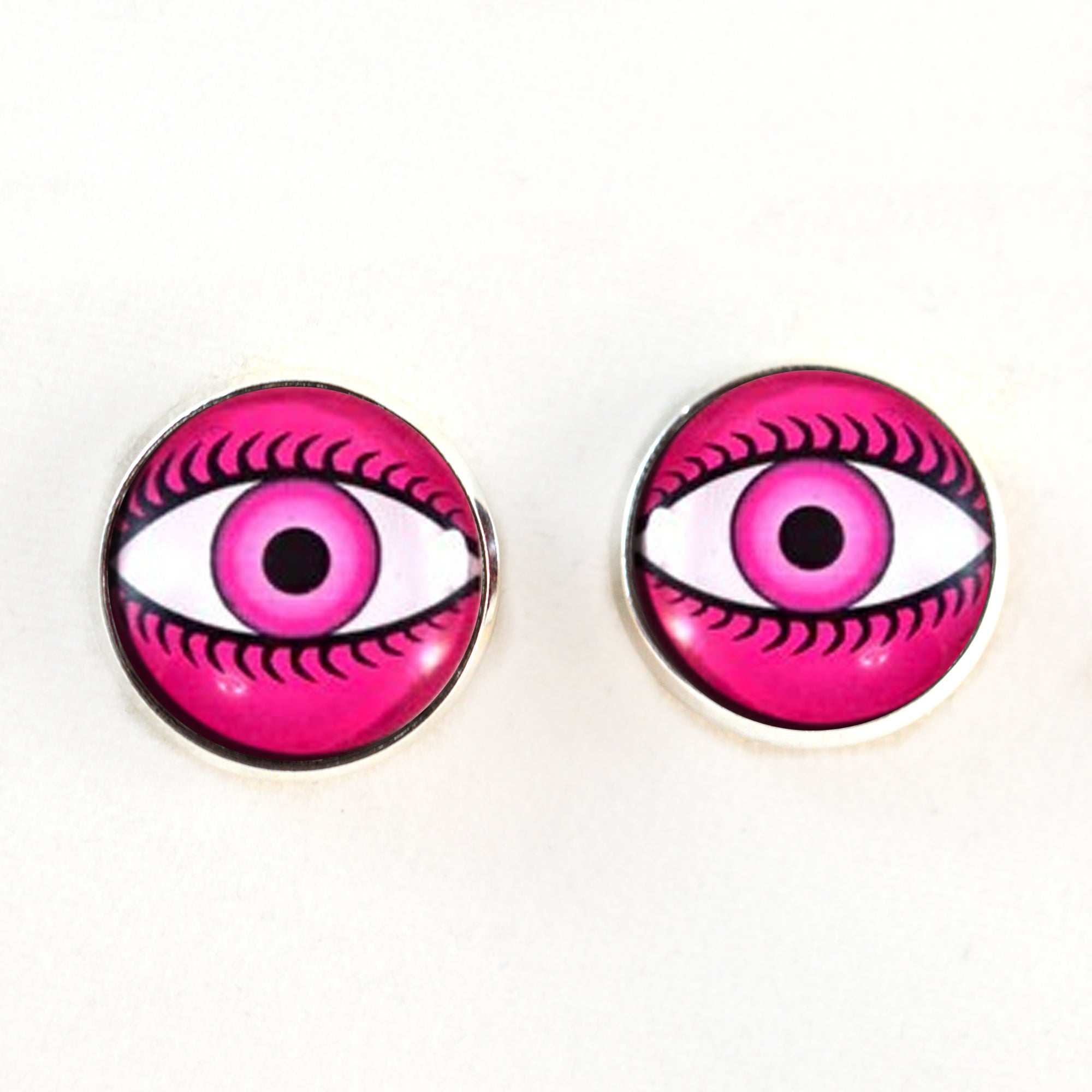 These eye-catching, hot pink evil eye rendered and inspired glass eyes add bold color to your projects in their sew on bezel setting. Handcrafted with bold detail, each cabochon features the timeless symbol of the evil eye—believed for centuries to ward off negativity and attract good fortune.