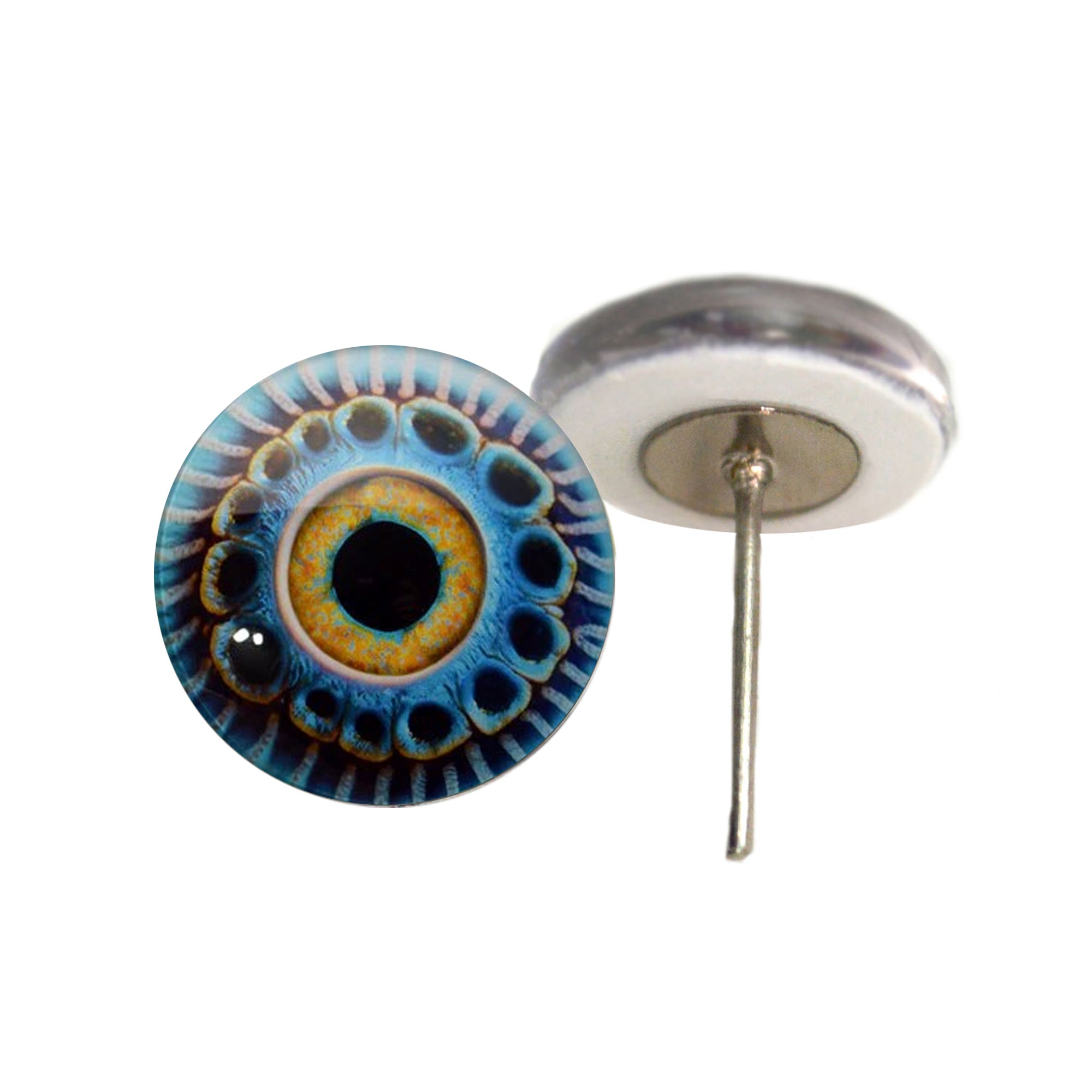 These wire pin post glass eye cabochons are made with high quality card stock print-out of the original digital designs and attached to a glass cabochon dome with diamond glaze resin and attached to the silver toned post backings.