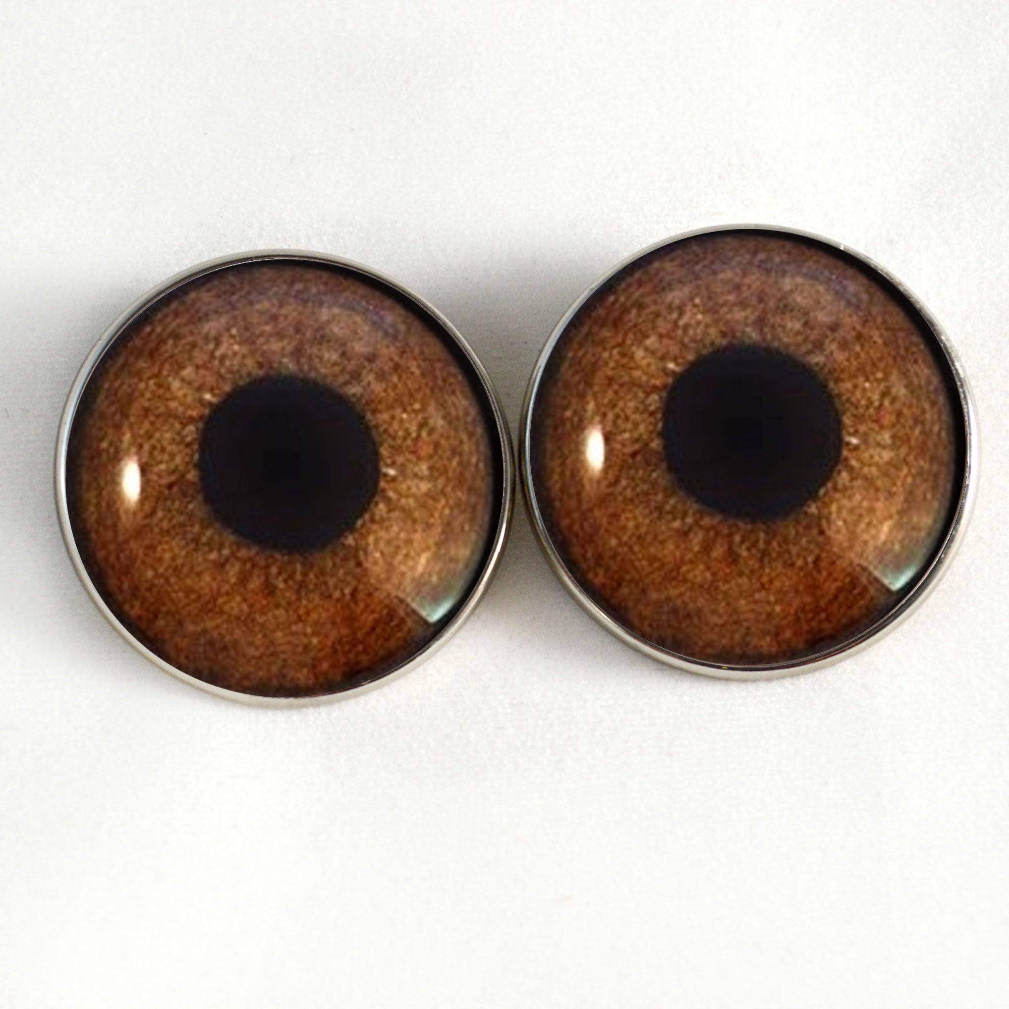 The glass eyes set in the silver toned sew on bezels measure your choice of 10mm, 16mm, 25mm, or 30mm.