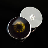 These glass eyes are buttons with loops on the back of their silver-colored metal settings. This pair of glass eyes is perfect for creating your stuffed or crochet animal creature or soft sculpture, or for use in creative jewelry making.