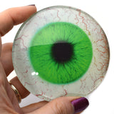 These massive 3-inch wide glass eyes depict bright green, white scerla human style irises with rounded black pupils at their center.